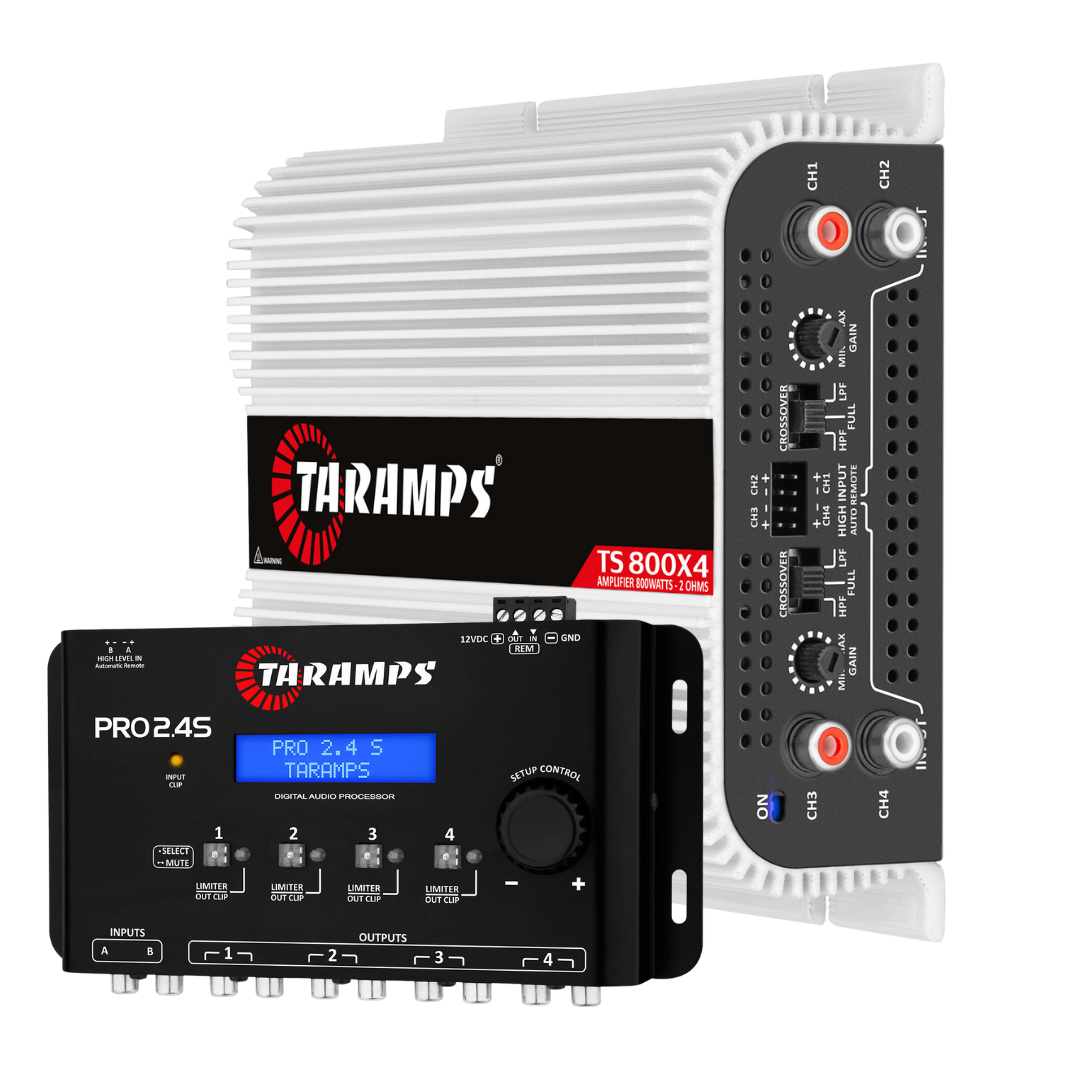 Enhance your car audio system with the Taramps TS 800x4 Amplifier and PRO 2.4S Processor Combo. With powerful 4-channel performance for crisp mids and highs and advanced sound tuning capabilities, this combo offers unmatched clarity, balance, and control for your audio experience.